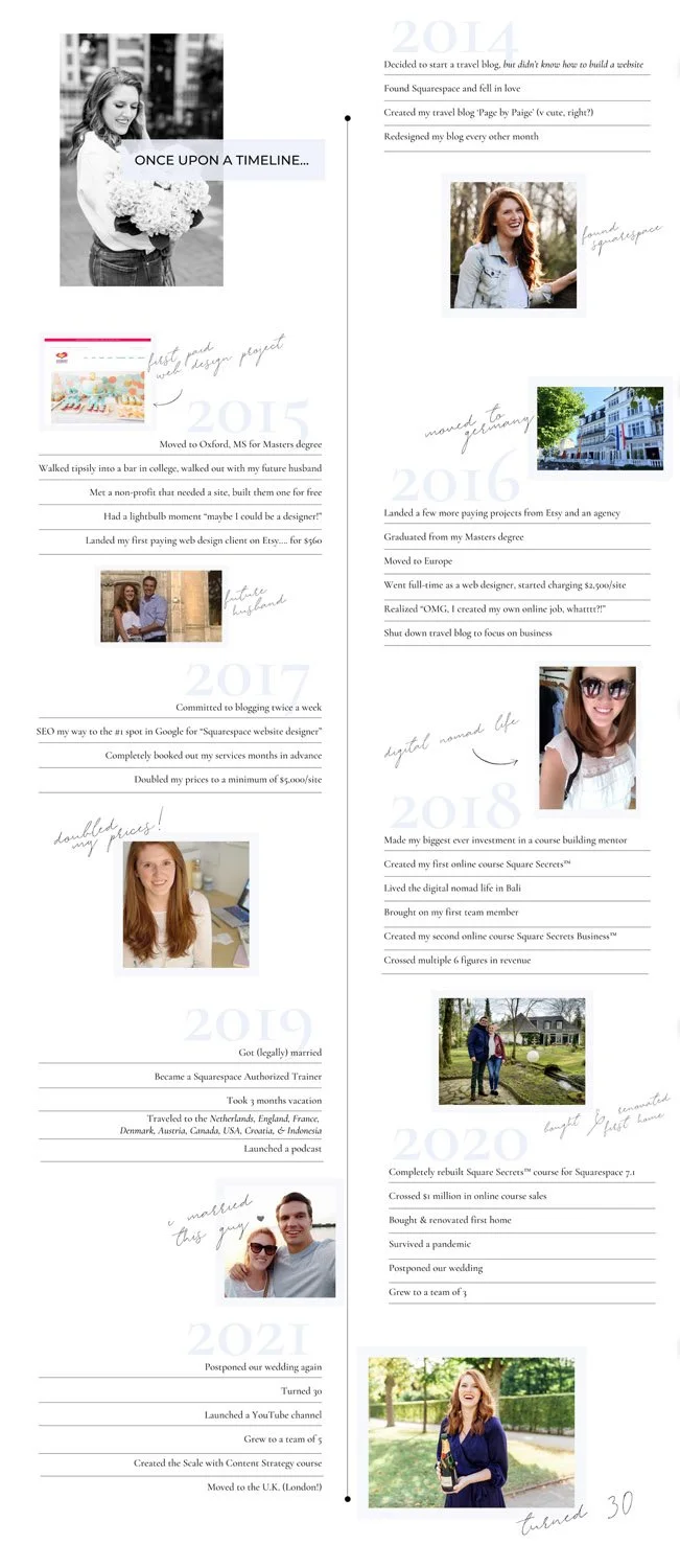 I love timeline content on an about page, but I like it even more when it’s short, to the point & has highlights that I can skim - like this from Sophia Amoruso, or this, which is a bit lengthier, but static from Paige Brunton.