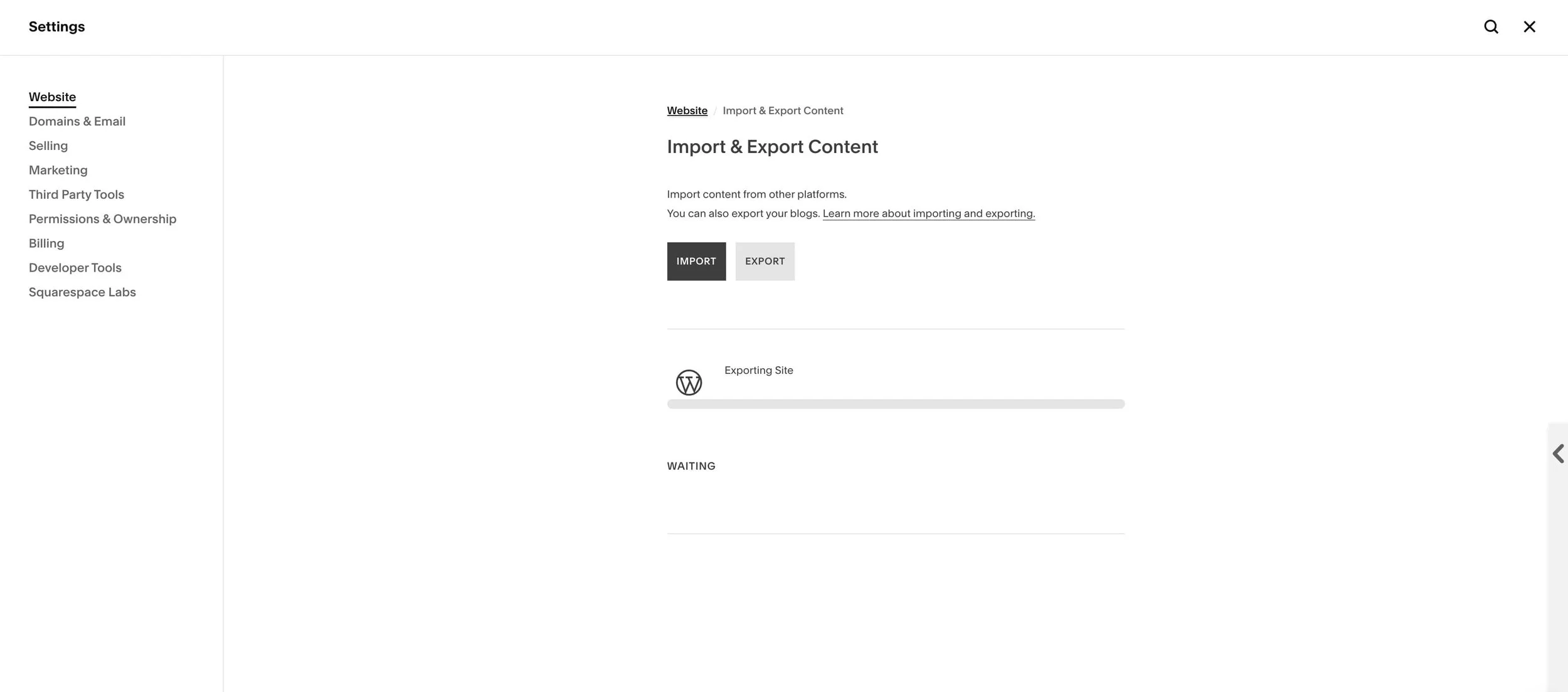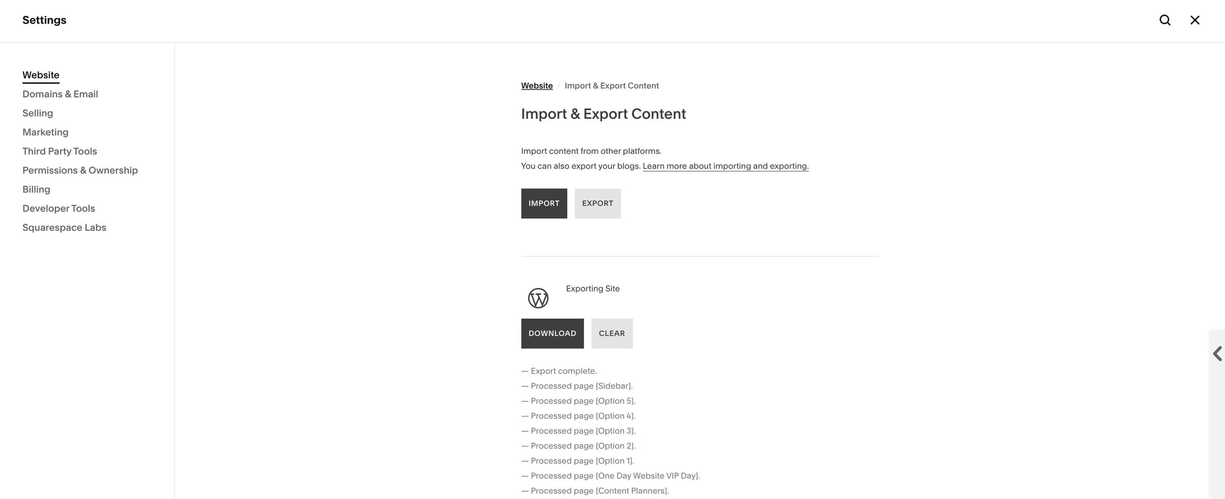 Click Export to export your Squarespace website xml file