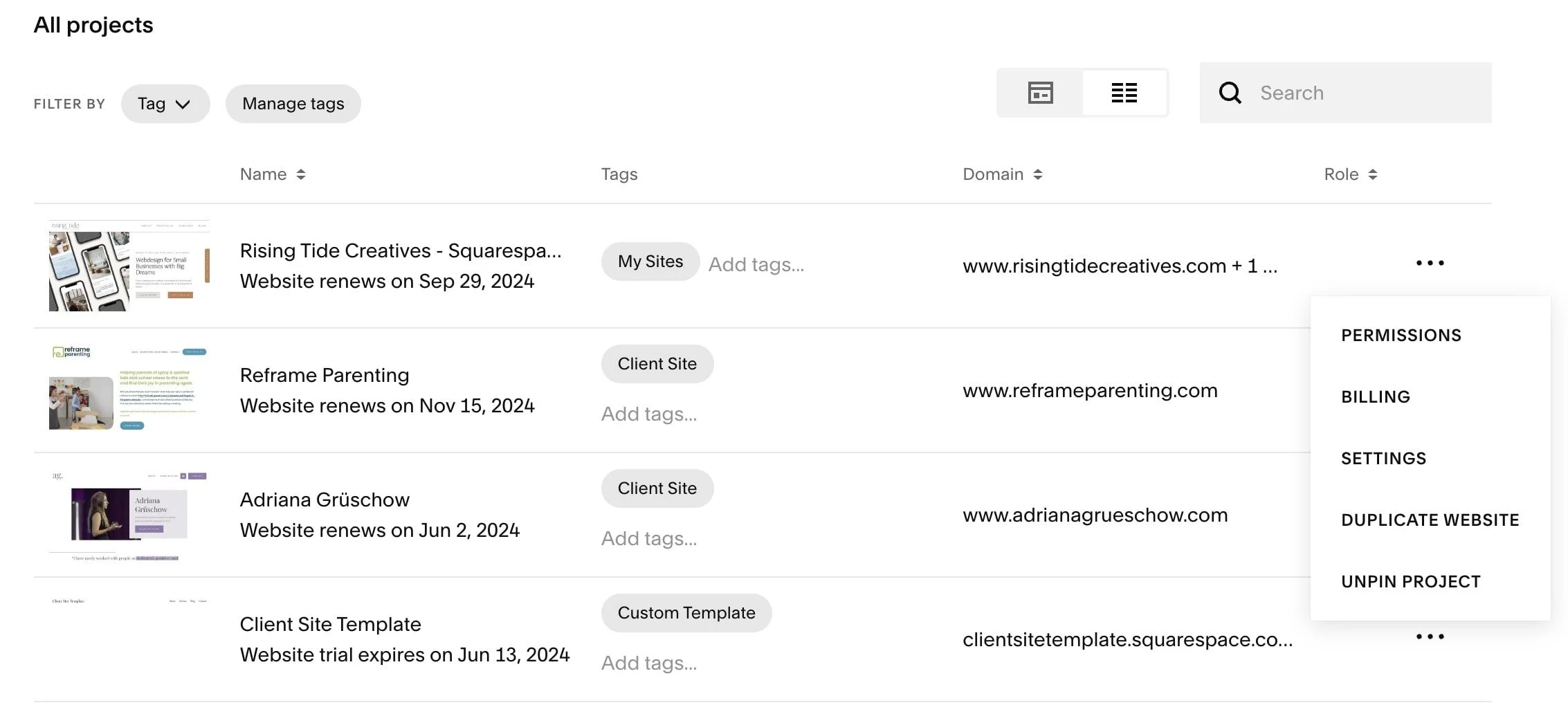 To make a duplicate to backup your Squarespace Website simply click the three dots to the right of your site in the main menu on Squarespace and select “Duplicate”.