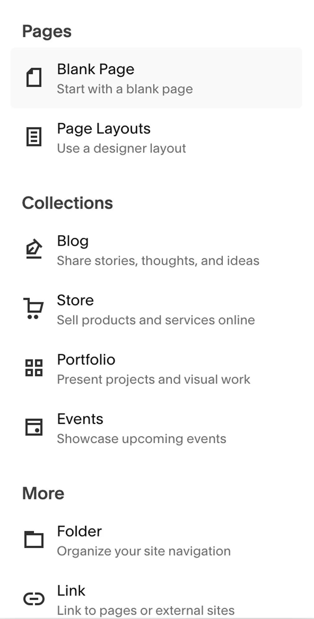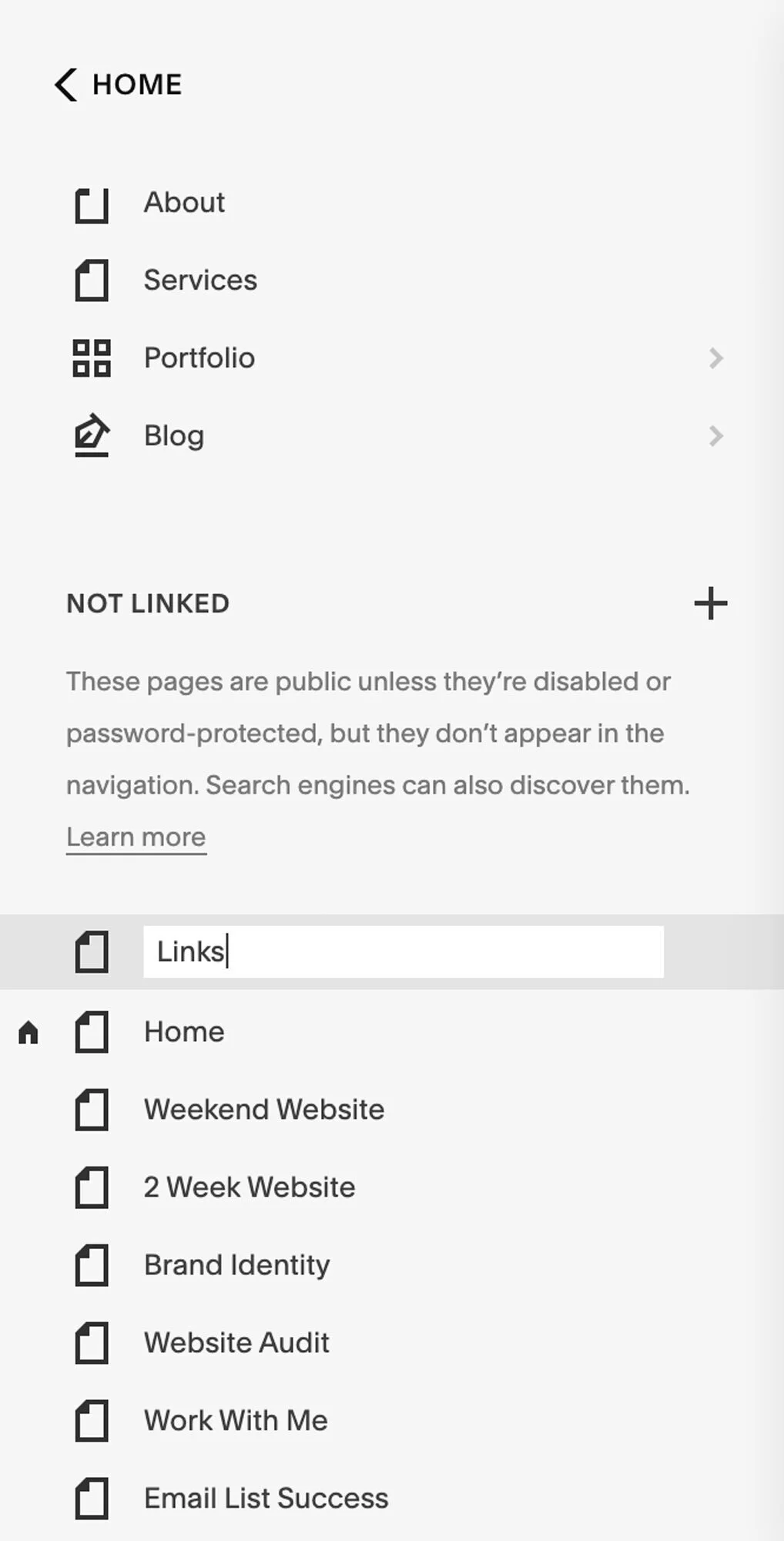Create an unlinked page on Squarespace. Do this by navigating to the “Pages” area on the left hand menu. Then clicking on the “+” button in the “Not Linked” section. We are creating this page in the Not Linked section because of course we do not want it to show up in our navigation bar. This will be our linkinbio page or our linktree.