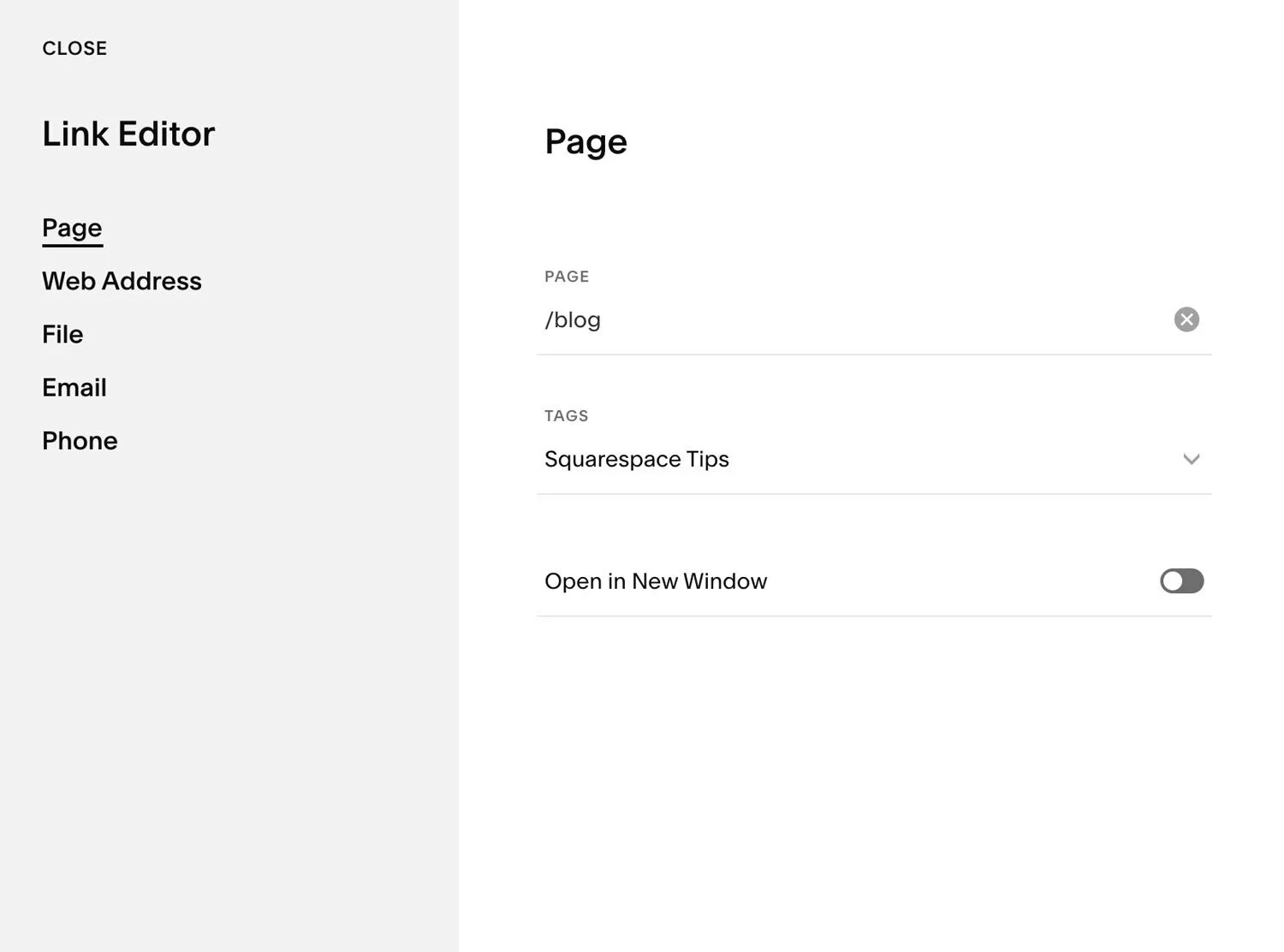 If you have blog content you want to link to you can add a tag filter to your button meaning that your blog page will be automatically filtered by this. It’s a great tool if you have different themes of content (for example in my case - Squarespace tips vs. small business advice) meaning that people can get directly to the content that’s interesting for them. To do this simply connect a button to your blog, then choose a filter (by tag).