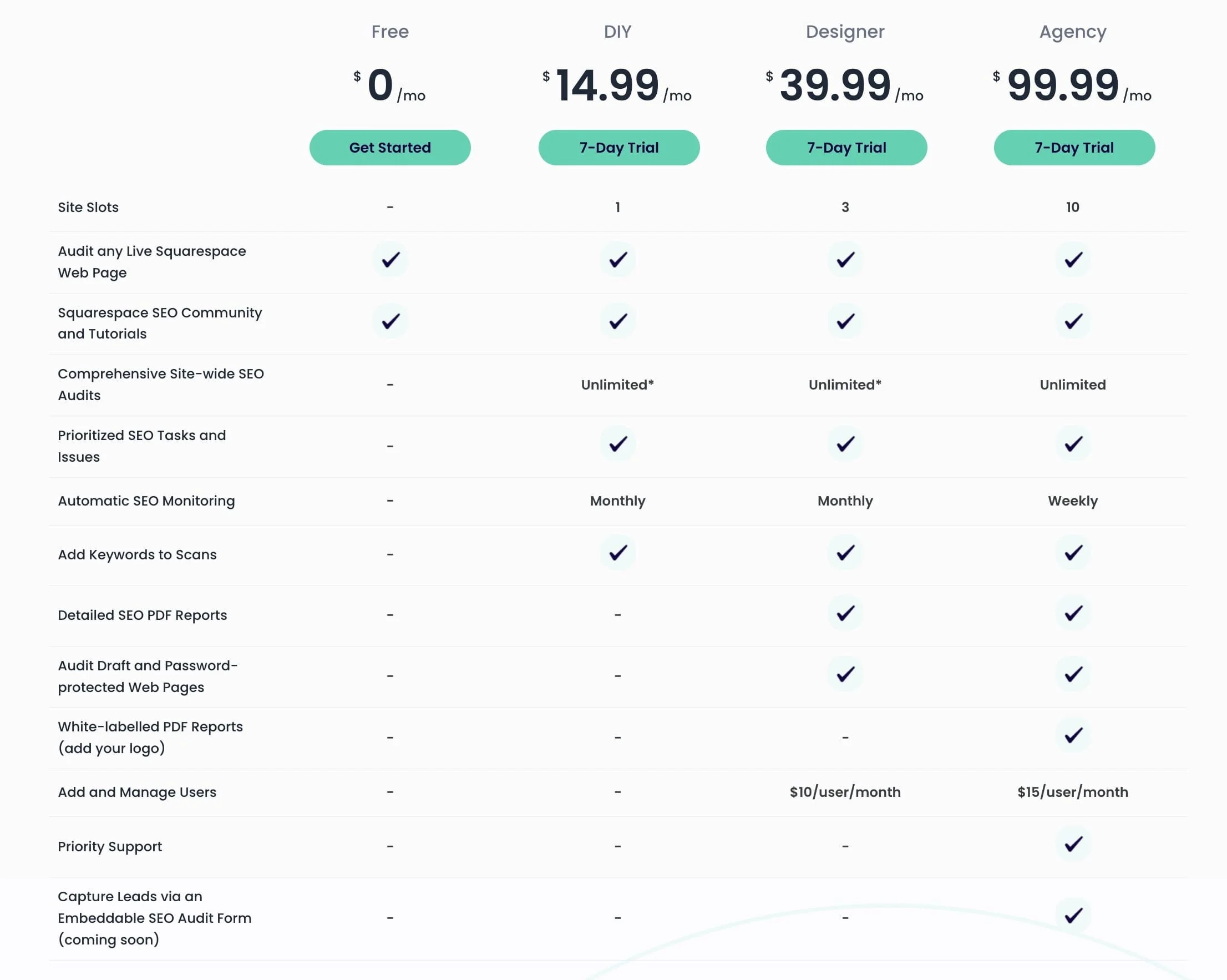 SEOSpace uses a freemium model - ie there’s a free tier and then paid-for tiers set up for both individual business (managing one Squarespace site) and agencies who are managing multiple sites. The pricing for the individual level is $14.99 at the time of writing - and, as you’ll see in a minute when you offset that against the amount of time it can same you it’s legit a steal!