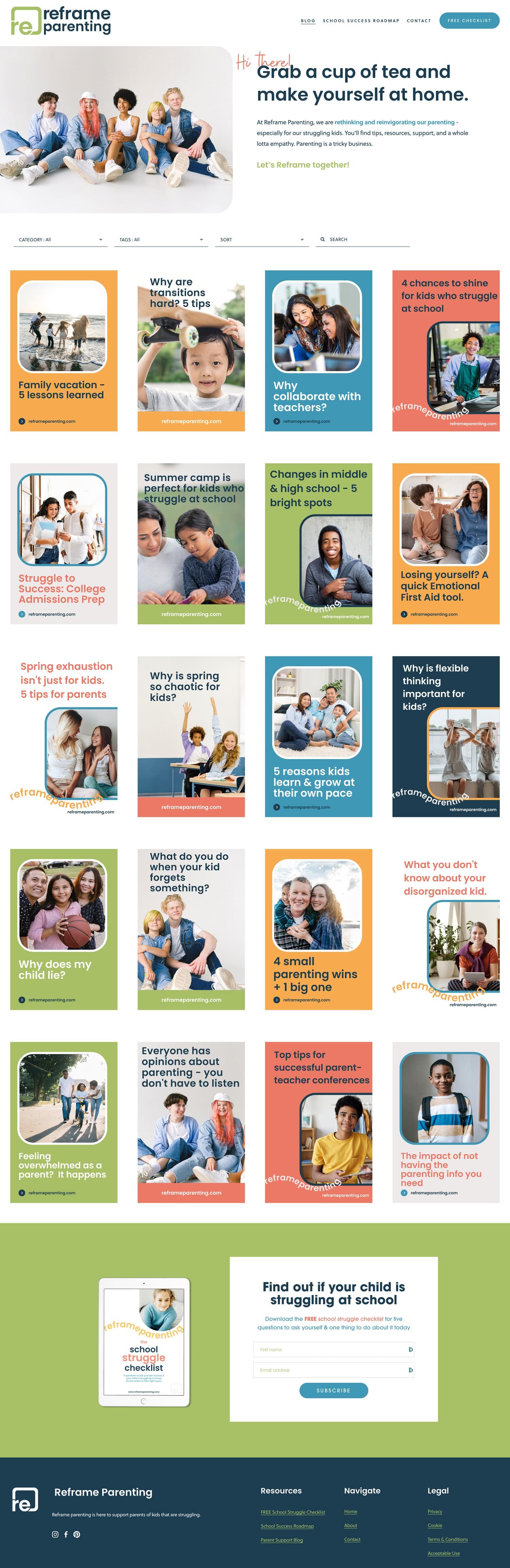 This clean and colorful blog for Reframe parenting brought is a great example of using blog post thumbnail designs to create a cohesive and on brand collection of images for your blog posts. Along with a short but sweet blurb to let people know they’re in the right place, the search and filter functionality (our friends at Square Websites with their universal filter once again!) makes it easy for parents to find what they’re looking for.