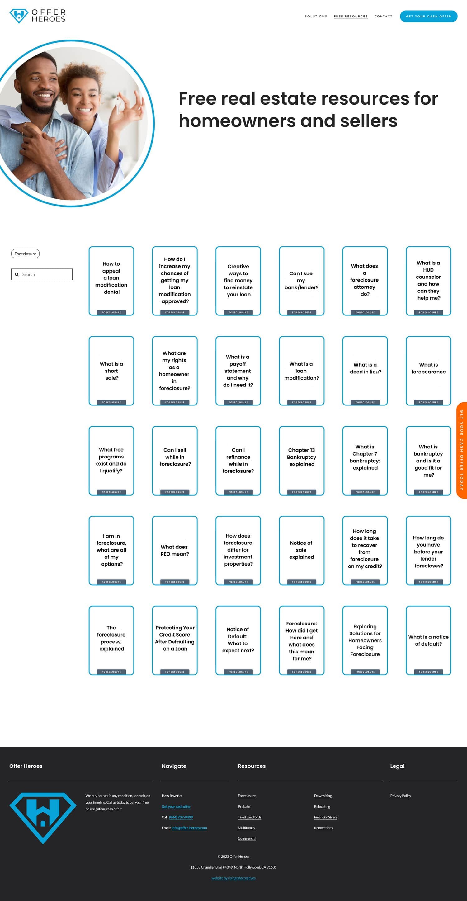 This blog on the website of Offer Heroes is a growing repository of free help and support articles, once again searchable using a simple application of the Universal Filter plug in, and a very simple paired back hero section that uses the same image styling as is found throughout the rest of the website. Simple, but effective & driving traffic from their target audience to their site.