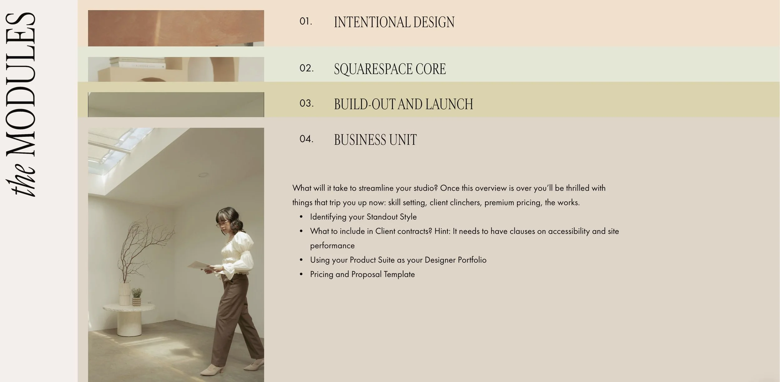At the time of writing the Standout Squarespace* Curriculum has two key parts to it, the first is the Foundations phase - which you can purchase as a standalone, and which teaches you alll of the ins and outs of Squarespace a deep dive into design principles, plus, if you’re thinking of becoming a Squarespace Webdesigner as a business, a good chunk of content on web design business principles too.