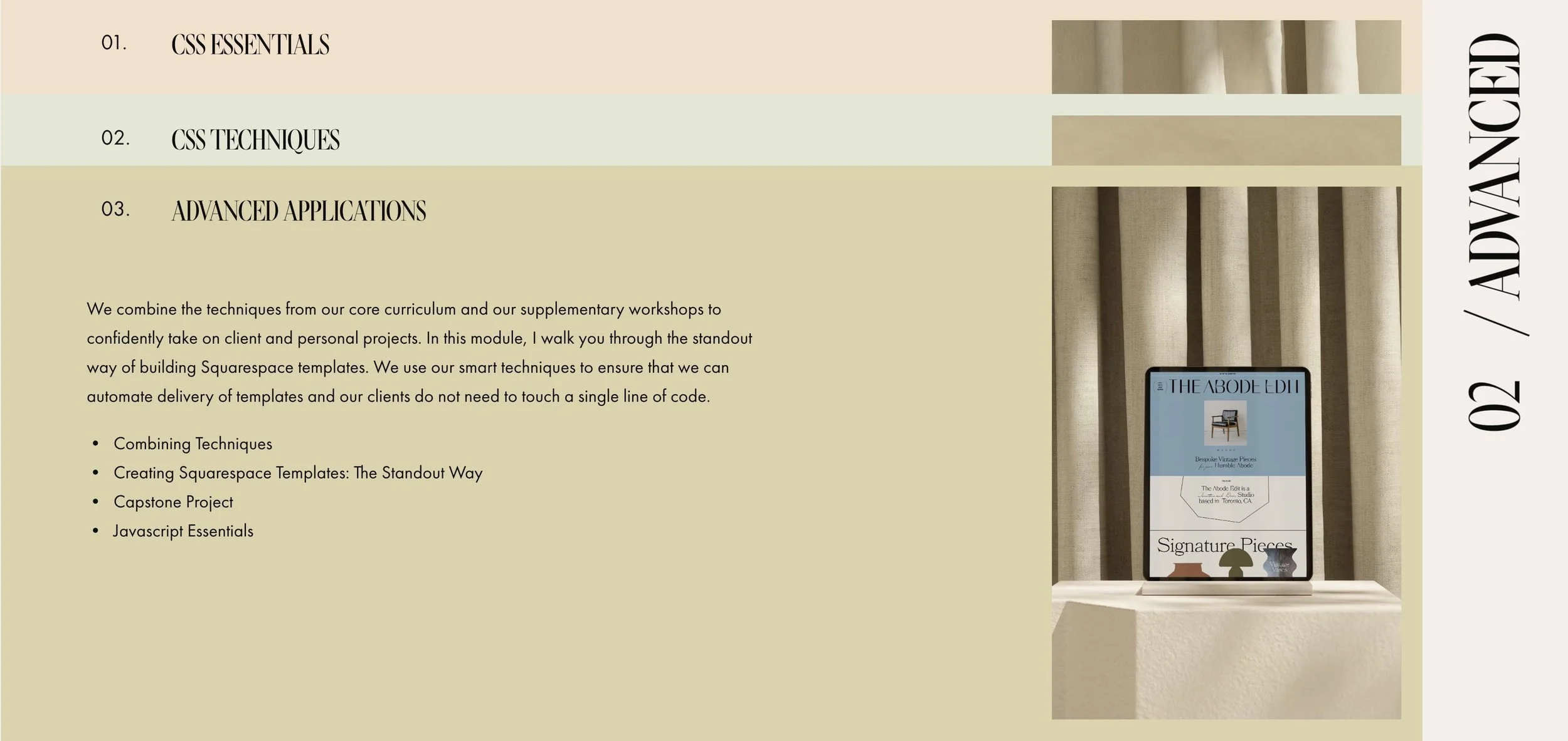 And you’d be right. Standout Squarespace Foundations has pretty much no code in it, that’s where the full Standout Squarespace course comes in with the “Advanced” part of the course. Rache revamped the curriculum for this course at the end of 2023 so it’s fully Fluid Engine compatible so here’s an overview.